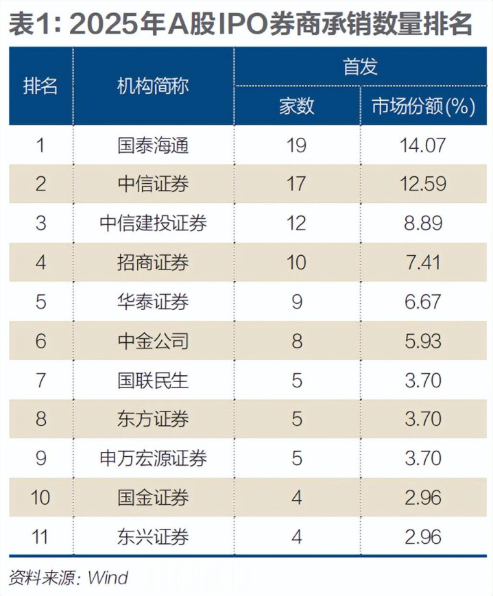 Wind(万得)数据显示,2025年A股IPO家数小幅增长至116家,募资金额约1317.71亿元,几乎实现翻倍增长。头部券商优势进一步凸显,同时在券商并购整合影响下,投行格局生变,国泰海通在IPO承销数量上反超中信证券,中信证券则在IPO收入上继续保持领先。